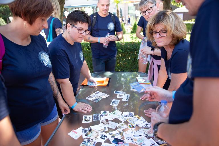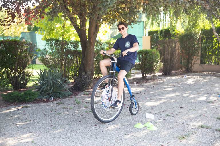 This is how a complete team-building game with 10 stations was born, which keeps its players on the move and alert throughout. Among other things, the teams had to go through an obstacle course in period vehicles. To make things more difficult, some bikes worked upside down and some had one wheel much bigger than the other. Those who preferred to exercise their brains had the chance to create a poem about the company using period words or to create a piece of clothing from the era using crepe paper and other tools. They could trade coins of the period and, in view of the heat, a water station was included in the games, which many took advantage of to take a dip in the pool.