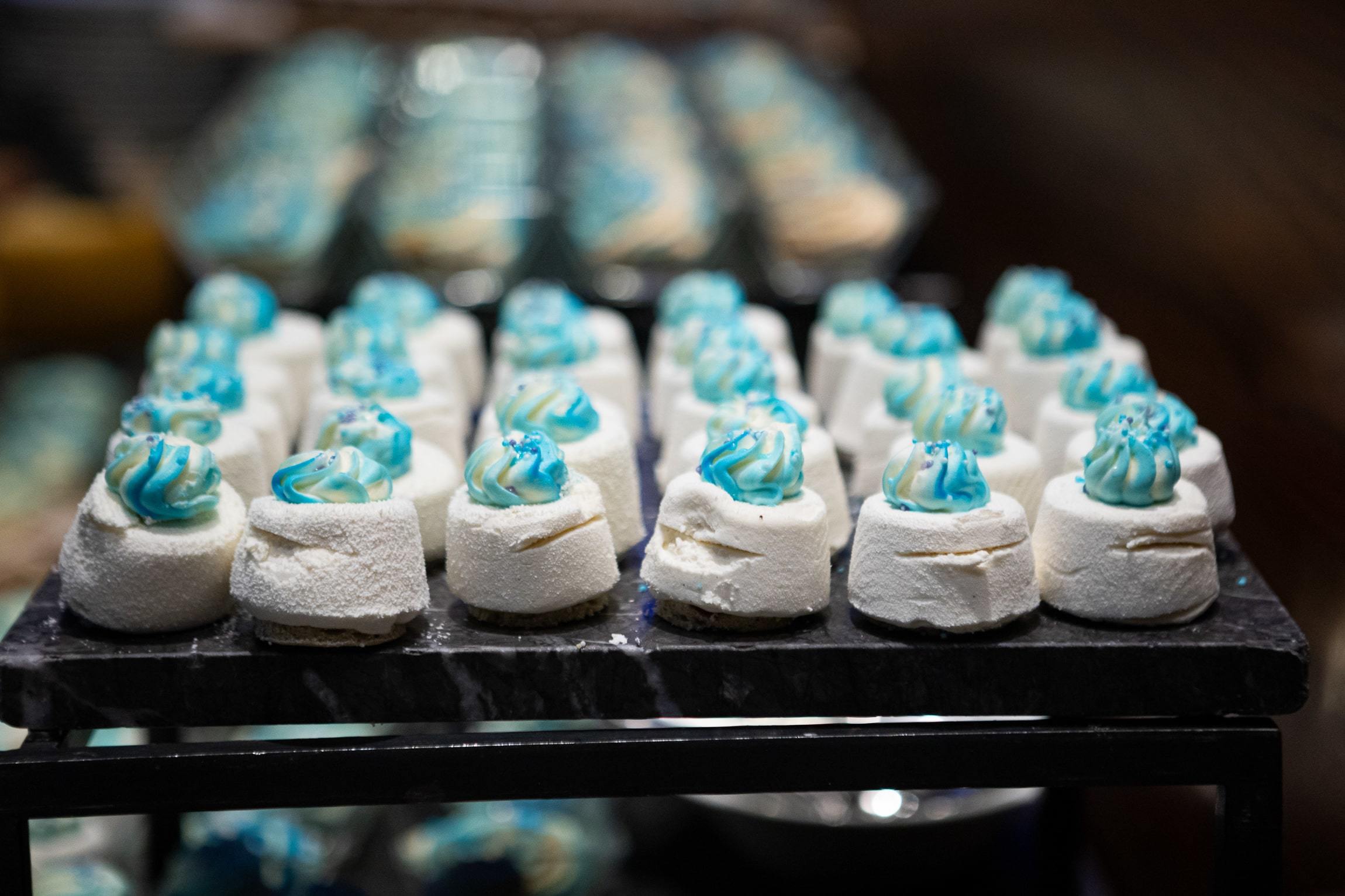 The hotel was our partner in all of this. The dessert counter offered a selection of blue cakes for guests to sample.