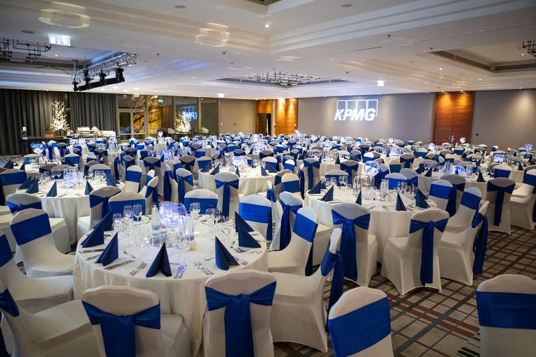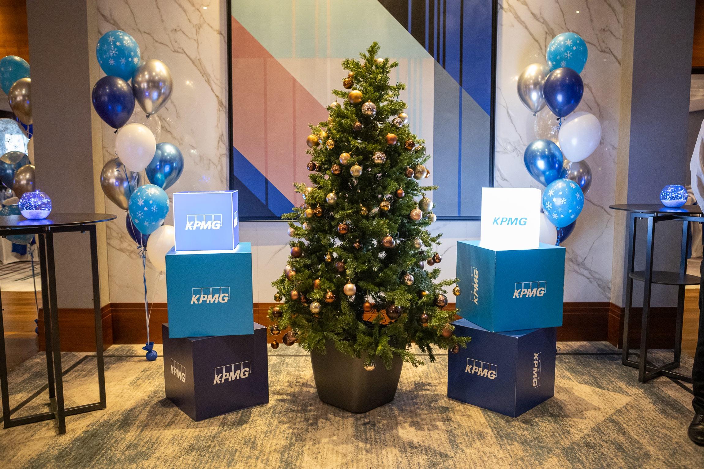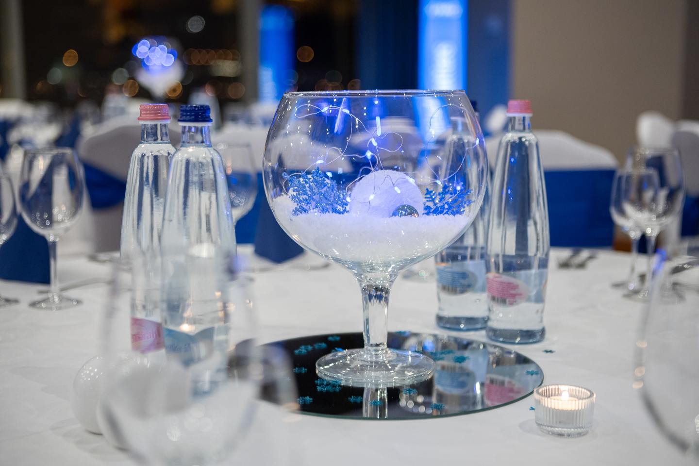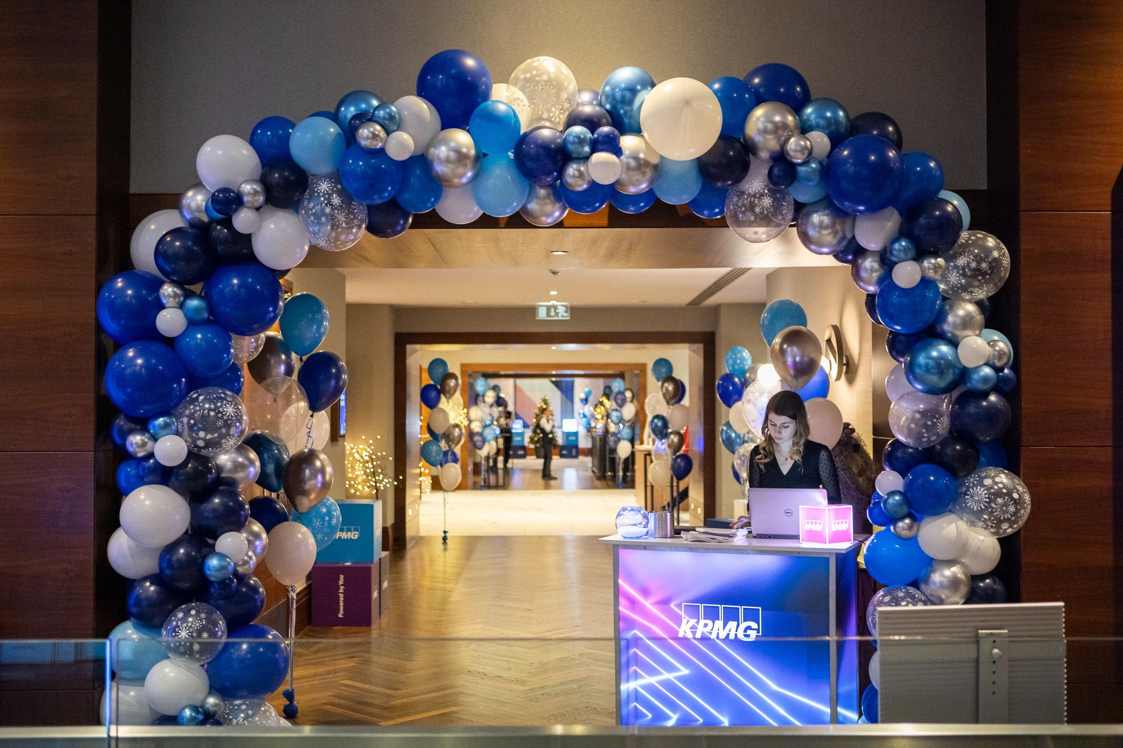 The blue decorations, reminiscent of a winter wonderland, covered the event hall, the corridors and even the entrance. We added a Christmas tree and snowflakes to add to the festive magic.